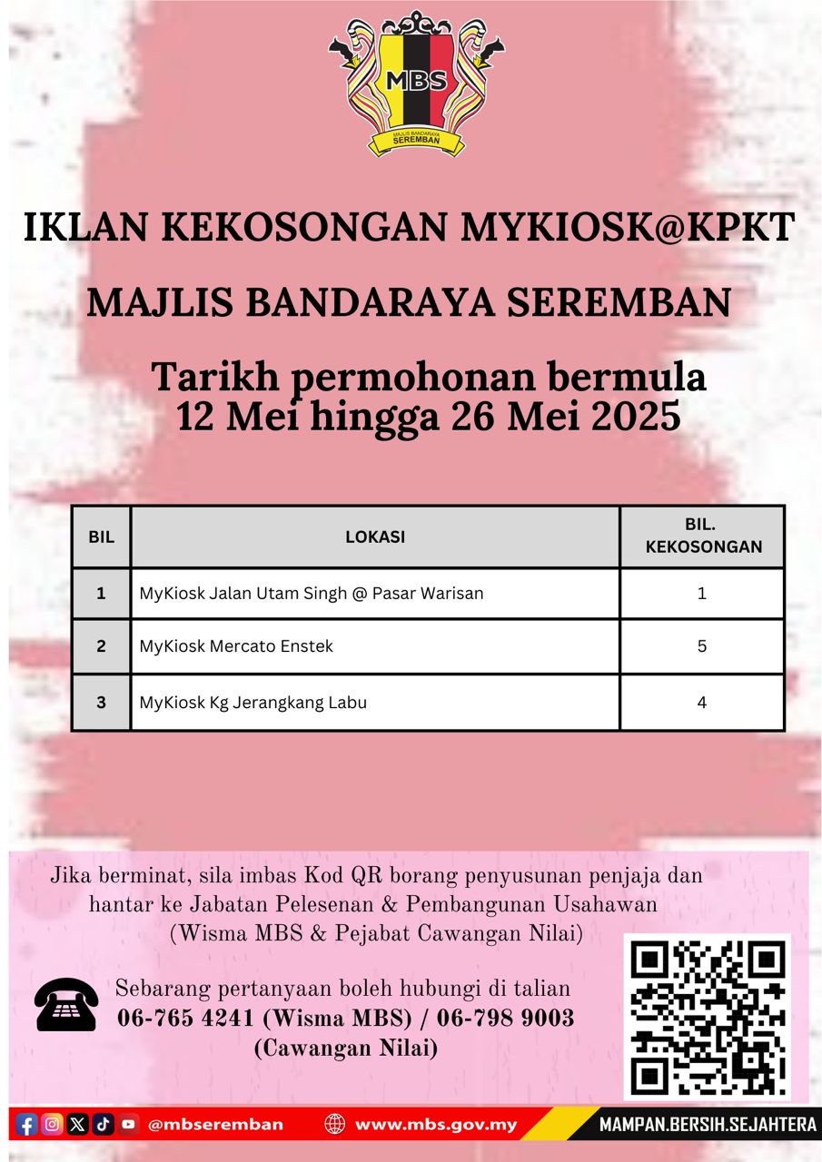 Untuk makluman, Majlis Perbandaran Seremban dan Majlis Perbandaran Nilai akan menjadi satu entiti baru iaitu Majlis Bandaraya Seremban mulai 1 Januari 2020. Sehubungan itu, Portal Rasmi Majlis Perbandaran Seremban di pautan http://www.mpsns.gov.my dan semua aplikasi atas talian MPS akan ditutup bermula 24 Disember 2019 selepas jam 5.00 petang sehingga 31 Disember 2019. Antara aplikasi atas talian yang terlibat adalah seperti berikut: