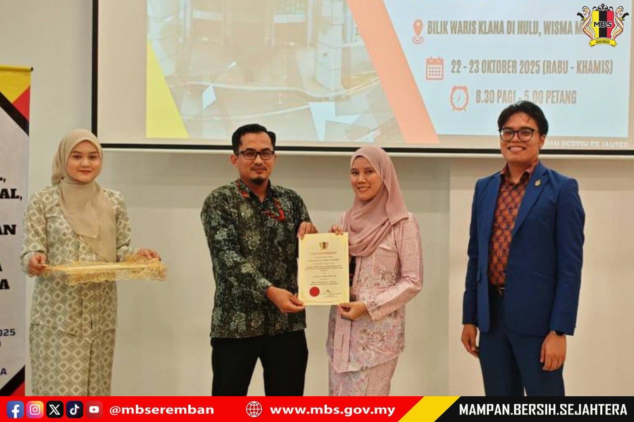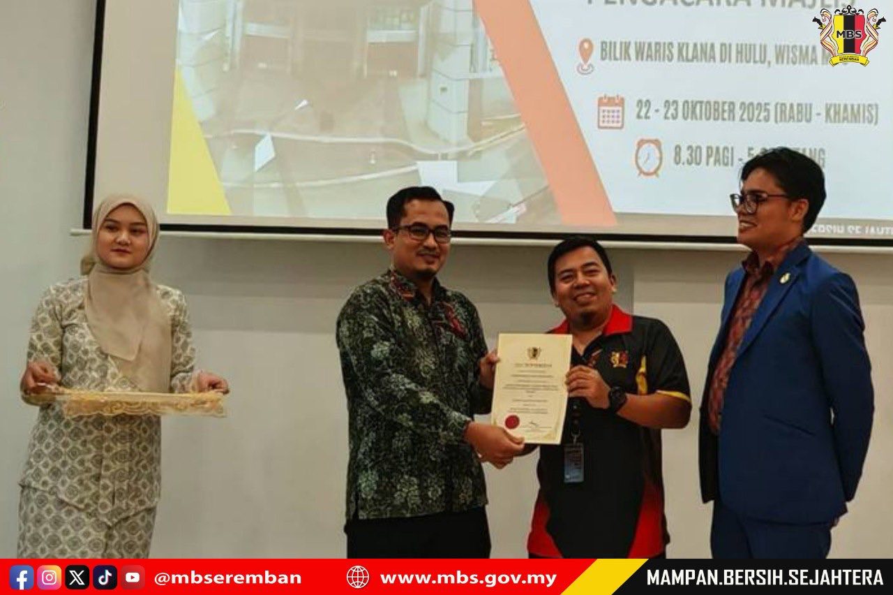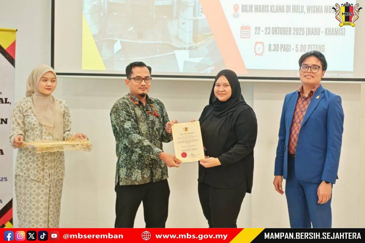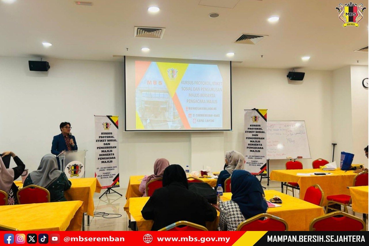 Seremban, 23 October 2025 – The Seremban City Council (MBS) organized a Protocol, Social Etiquette and Event Management Course with Master of Ceremony Training at the Bilik Waris Klana Di Hulu, Wisma MBS. The purpose of this course was to provide participants with knowledge, skills, and exposure on the proper procedures for managing and conducting both formal and informal events according to established standards. MBS invited Mr. Albasya’ari bin Abdul Latif, Public Relations Officer from the Corporate Section, Office of the State Secretary of Negeri Sembilan, as the facilitator for the two-day course. A total of 40 participants comprising staff from various departments were selected to attend the course. The closing ceremony was officiated by Mr. Shamaruddin bin Saidin, Head of the Corporate Communications Unit, MBS.