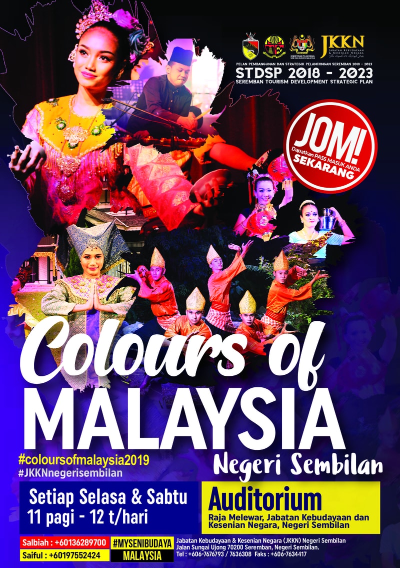 Colours of Negeri Sembilan is a cultural performance of Negeri Sembilan, which is brought especially to the tourists when they visit Seremban. These unique performances and shows showcasing different types of cultural dance of Negeri Sembilan communities – such as Masyarakat Adat Perpatih, Kaum Cina,India, Aborigines (Orang Asli/asal), Sabah and Sarawak. Programs will be held every Tuesday and Saturday located at the Jabatan Kebudayaan Keseniaan Negera, Negeri Sembilan.