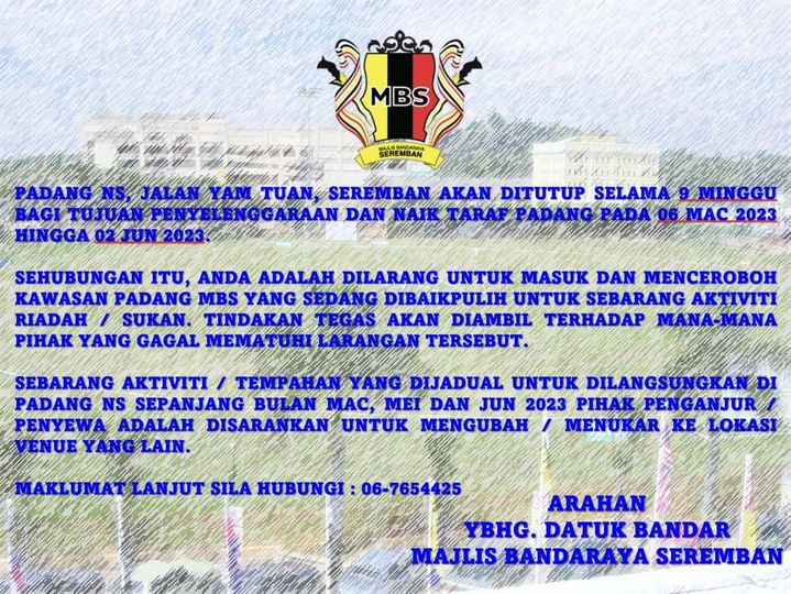 Padang NS Jalan Yam Tuan akan DITUTUP selama 9 minggu bagi tujuan penyelenggaraan dan naiktaraf padang mulai 6 Mac 2023 hingga 2 Jun 2023.