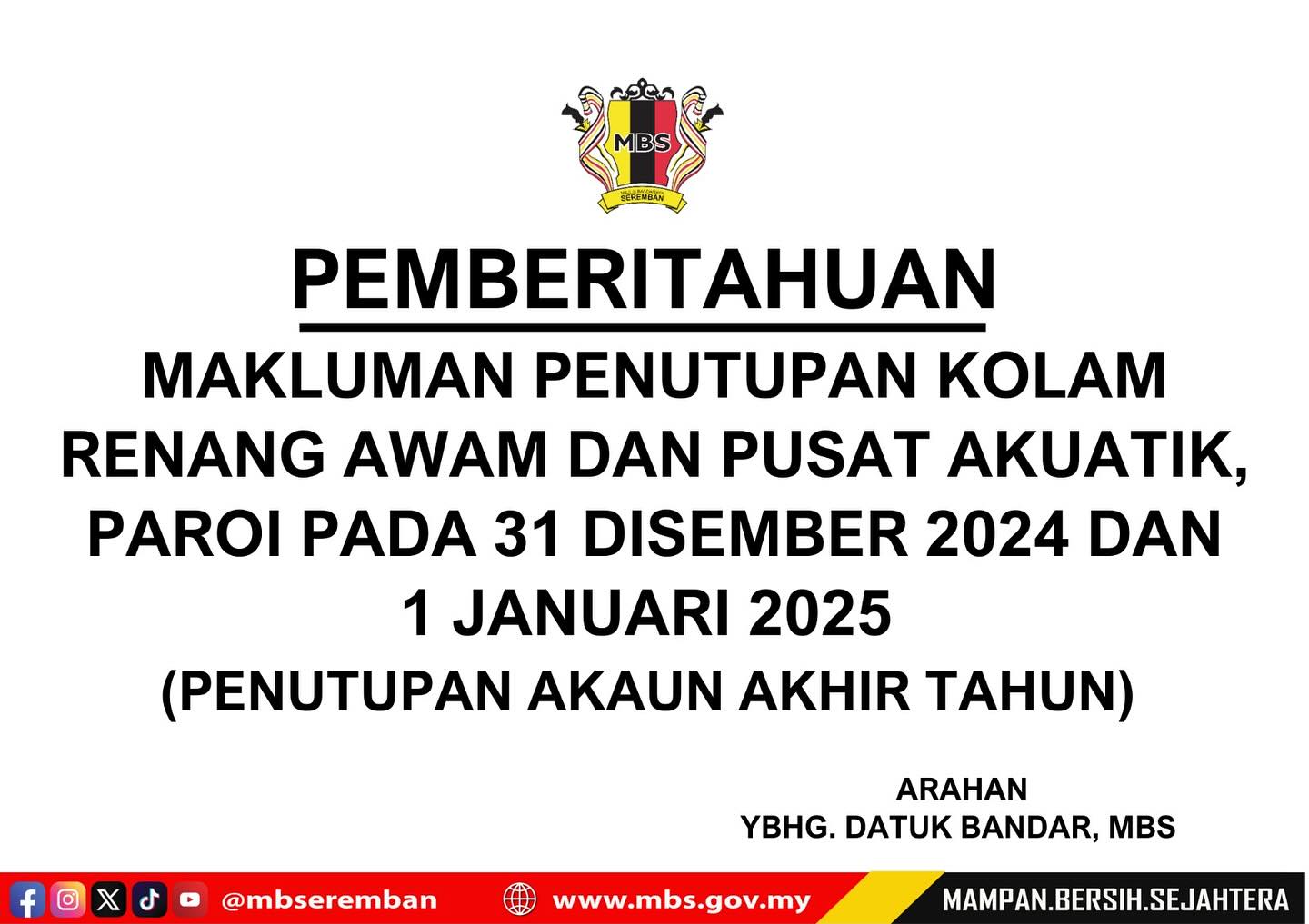 29 views Penutupan Kolam Renang Awam dan Pusat Akuatik, Paroi pada 31 Disember 2024 & 1 Januari 2025 bagi penutupan akaun akhir tahun MBS