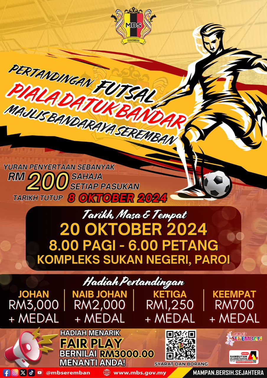 Pertandingan Futsal Piala Datuk Bandar Majlis Bandaraya Seremban Sempena Hari Sukan Negara bagi tahun 2024 kembali semula !!! Pertandingan yang menawarkan hadiah wang tunai bagi Johan bernilai RM3,000.00 ini, akan dianjurkan pada 20 Oktober 2024 bertempat di Kompleks Sukan Negeri, Paroi, Seremban !!!