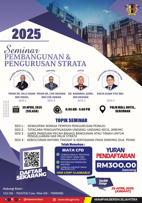 Unit Pesuruhjaya Bangunan (COB) Majlis Bandaraya Seremban (MBS) akan mengadakan Seminar Pembangunan & Pengurusan Strata Tahun 2025 seperti ketetapan berikut :-