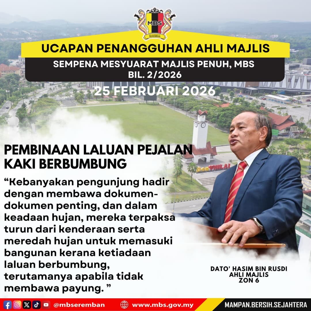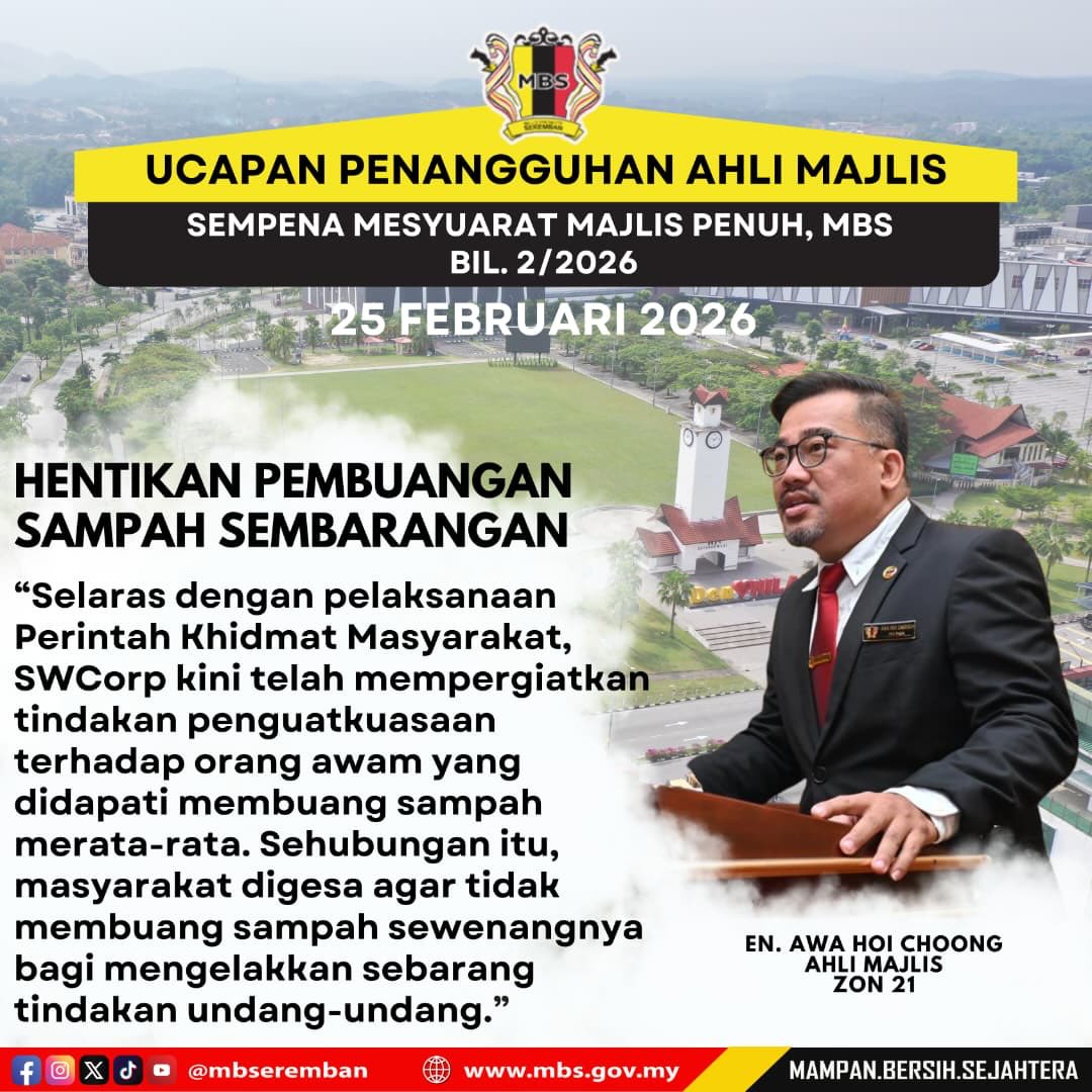 10 views Admin kongsikan antara intipati Ucapan Penangguhan Ahli Majlis, Majlis Bandaraya Seremban semasa Mesyuarat Majlis Penuh Bil.2/2026 yang telah diadakan pada 25 Februari 2026.