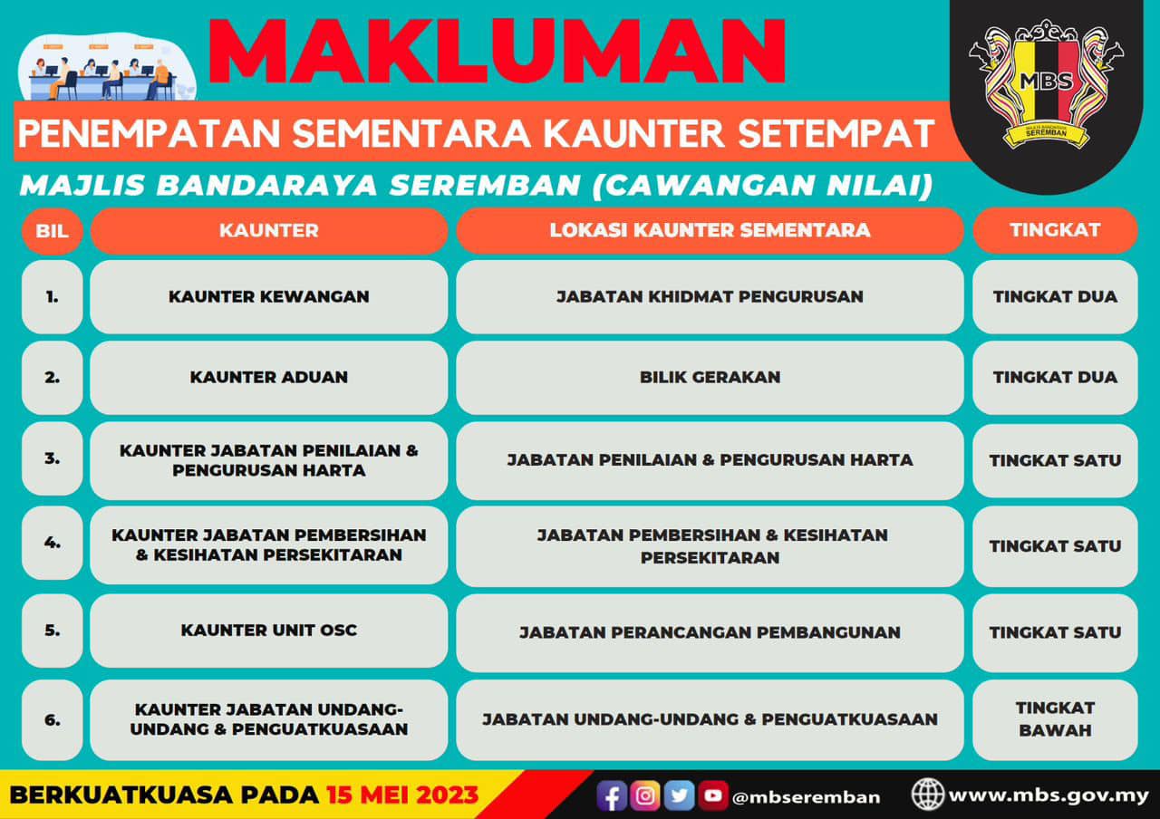 Kaunter Setempat Pejabat Cawangan Majlis Bandaraya Seremban di Nilai mengalami kerja-kerja ubahsuai bermula 15 Mei 2023.