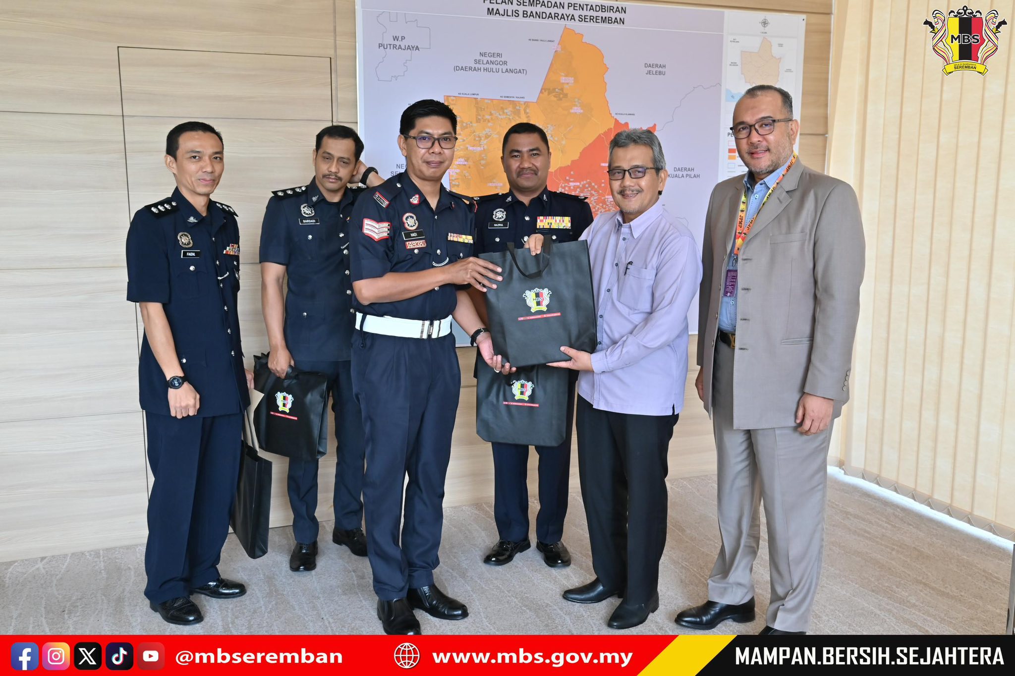 Seremban, 1 April 2026 - YBhg. Dato’ Ir. Ts. Haji Masri bin Baharuddin, Datuk Bandar Majlis Bandaraya Seremban (MBS) telah menerima kunjungan hormat daripada DSP Nazrul Azuan bin Nazeri, Pegawai Pemerintah Unit 7 Pasukan Simpanan Persekutuan Negeri Sembilan di Pejabat Datuk Bandar, Wisma MBS. Lawatan ini turut dihadiri ASP Muhammad Faizal Bin Jamal, Pegawai Penjaga Terup 7A PSP, ASP Junid Bardabi Bin Zakaria Pegawai Penjaga Terup 7B PSP, SJN Muhamad AlHadi Bin Mohd Yusuf - SJN Latihan Unit 7 PSP serta En Saiful Azuar bin Haji Ahmad Jadi, Pengarah Pembangunan Masyarakat & Pelancongan MBS.