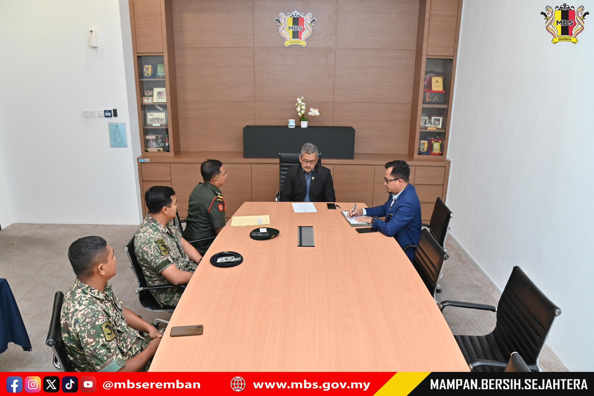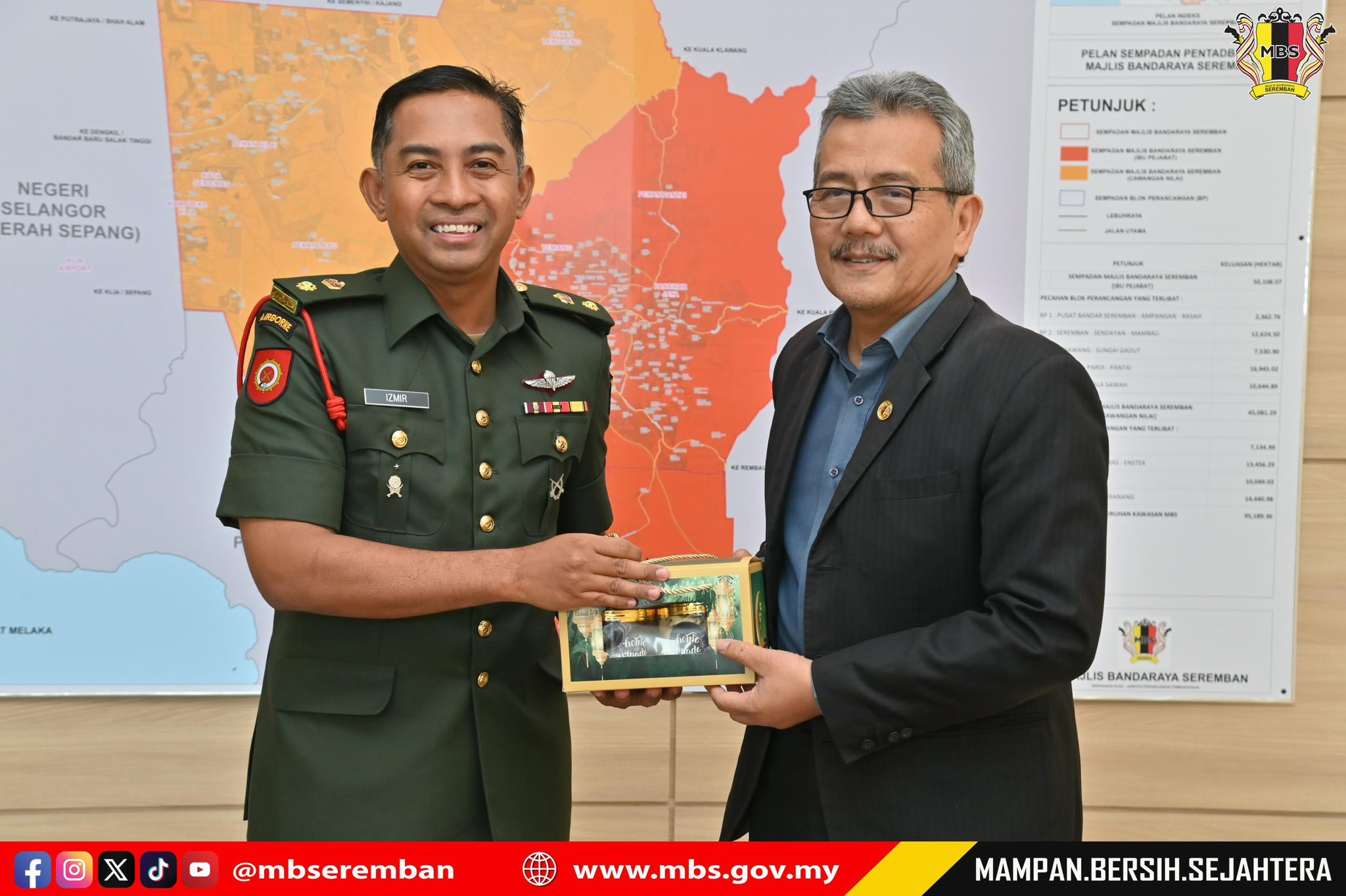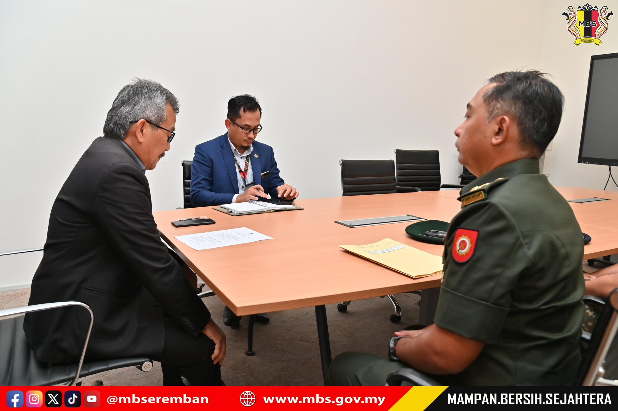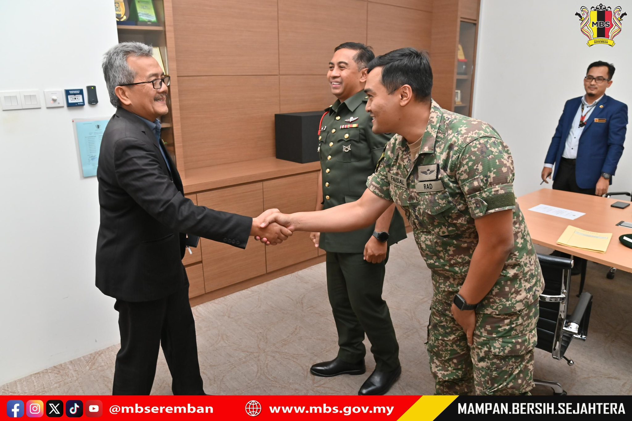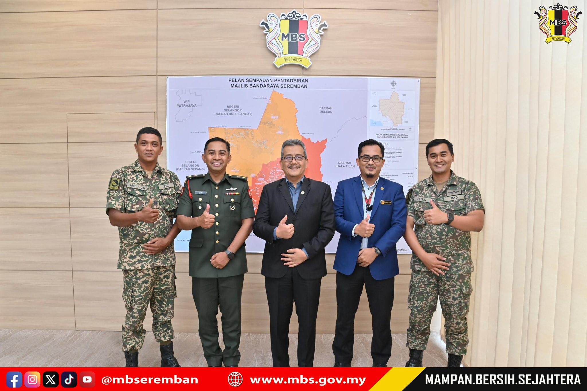 Seremban, 6 Mac 2026 - YBhg. Dato' Ir. Ts. Hj. Masri bin Baharuddin,  Datuk Bandar Majlis Bandaraya Seremban (MBS) telah menerima kunjungan hormat daripada Rejimen 508 Askar Wataniah, Kem Jalan Rasah semalam. Delegasi Rejimen 508 Askar Wataniah yang diketuai oleh Lt. Kol Mohd Adli Izmir bin Ramli, Timbalan Komander hadir dalam bertukar pandangan dan berkongsikan perkembangan Askar Wataniah di Negeri Sembilan. Hadir sama En. Shamaruddin bin Saidin,  Ketua Perhubungan Korporat MBS serta pegawai -pegawai tentera yang terlibat.