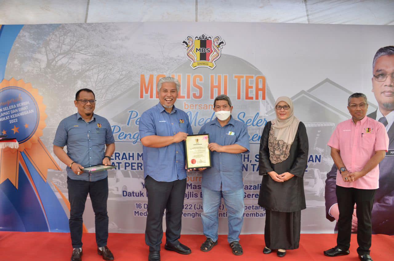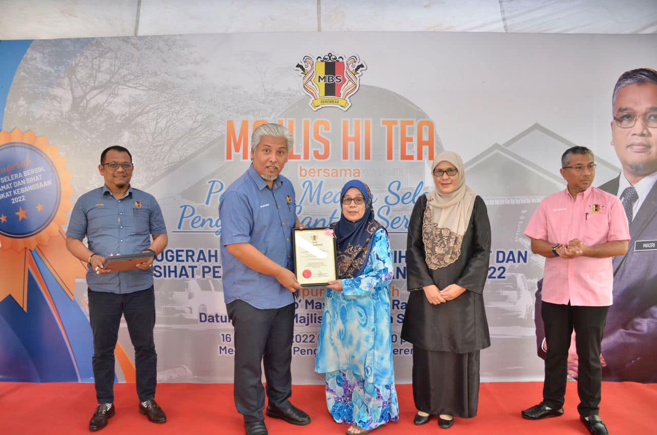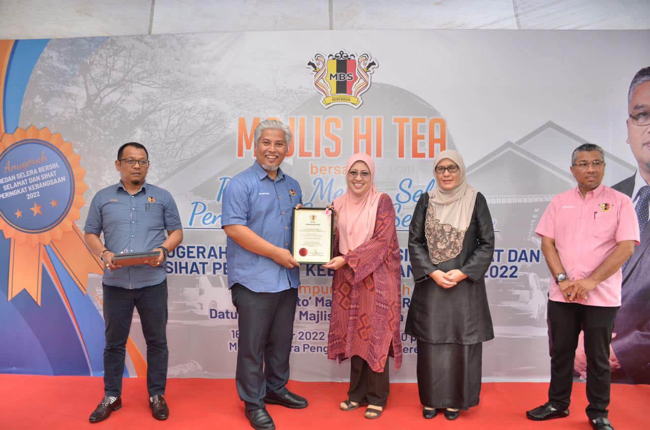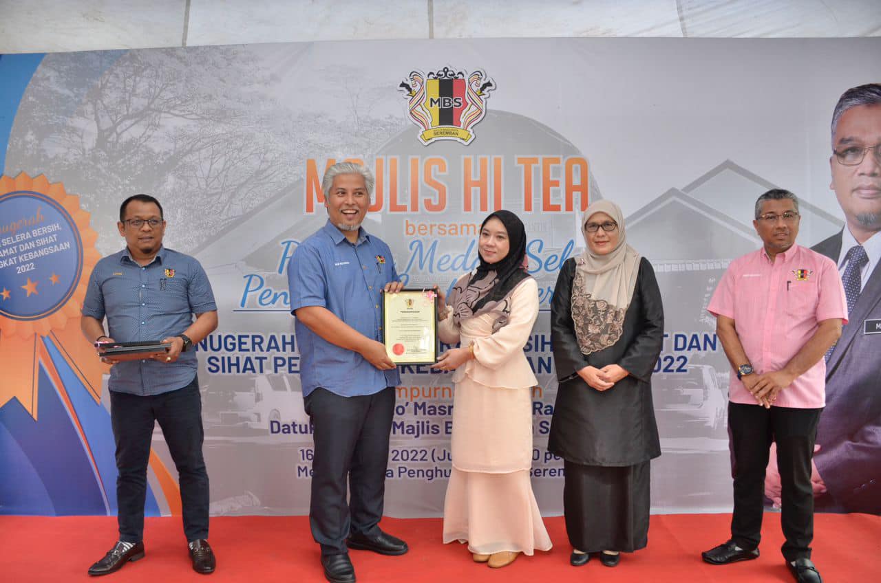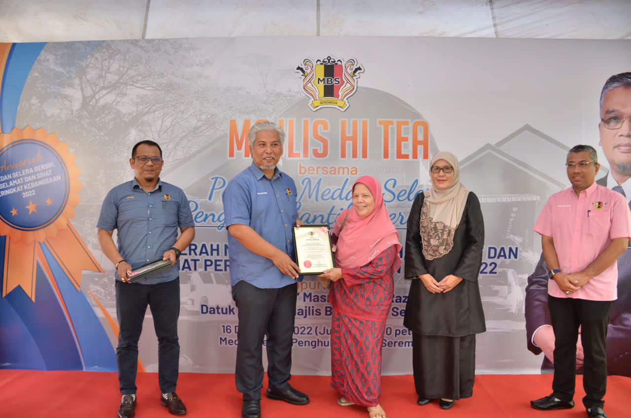 Tuan Mas Midyawan bin Yahya Setiausaha Majlis Bandaraya Seremban telah hadir mewakili YBhg. Dato’ Masri bin Haji Razali Datuk Bandar Majlis Bandaraya Seremban ke Majlis “Hi-Tea” Penghargaan Anugerah Medan Selera Bersih, Selamat dan Sihat Peringkat Negeri dan Kebangsaan Bagi Tahun 2022 di Medan Selera Penghulu Cantik. Majlis ini diadakan adalah untuk meraikan peniaga-peniaga Medan Selera Penghulu Cantik dan semua yang terlibat dalam Pertandingan Anugerah Medan Selera Bersih, Selamat dan Sihat Peringkat Negeri Sembilan Tahun 2022 Kategori Milik PBT/Agensi Kerajaan. Majlis Bandaraya Seremban telah mendapat tempat ketiga dalam pertandingan tersebut dan majlis penyampaian hadiah telah diadakan di Dewan Sri Melati, Pusat Persidangan Perbadanan Putrajaya. Medan Selera Penghulu Cantik telah menerima wang tunai berjumlah RM2,000.00 beserta sijil penghargaan. Turut hadir semasa majlis berlangsung ialah YBhg. Dato’ Dr. Harlina bt Abdul Rashid (Pengarah Kesihatan Negeri Sembiln), Dr. Noor Khalili bin Mohd Ali (Pegawai Kesihatan Daerah Seremban), Abdul Malek bin Adam (Ahli Majlis MBS), Ketua Jabatan & Ketua Unit MBS, Pembantu Ahli Majlis MBS serta peniaga-peniaga Medan Selera Penghulu Cantik.
