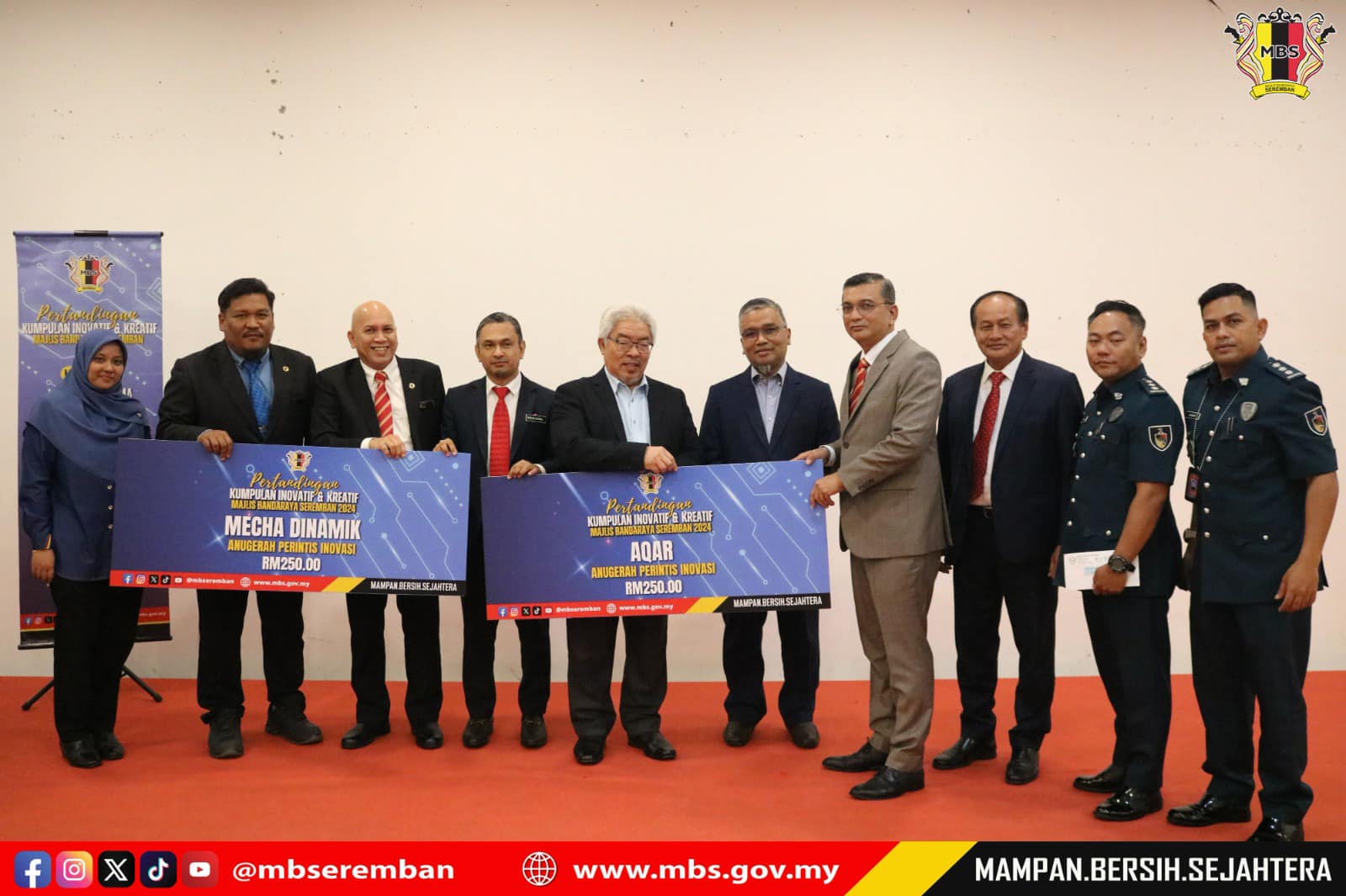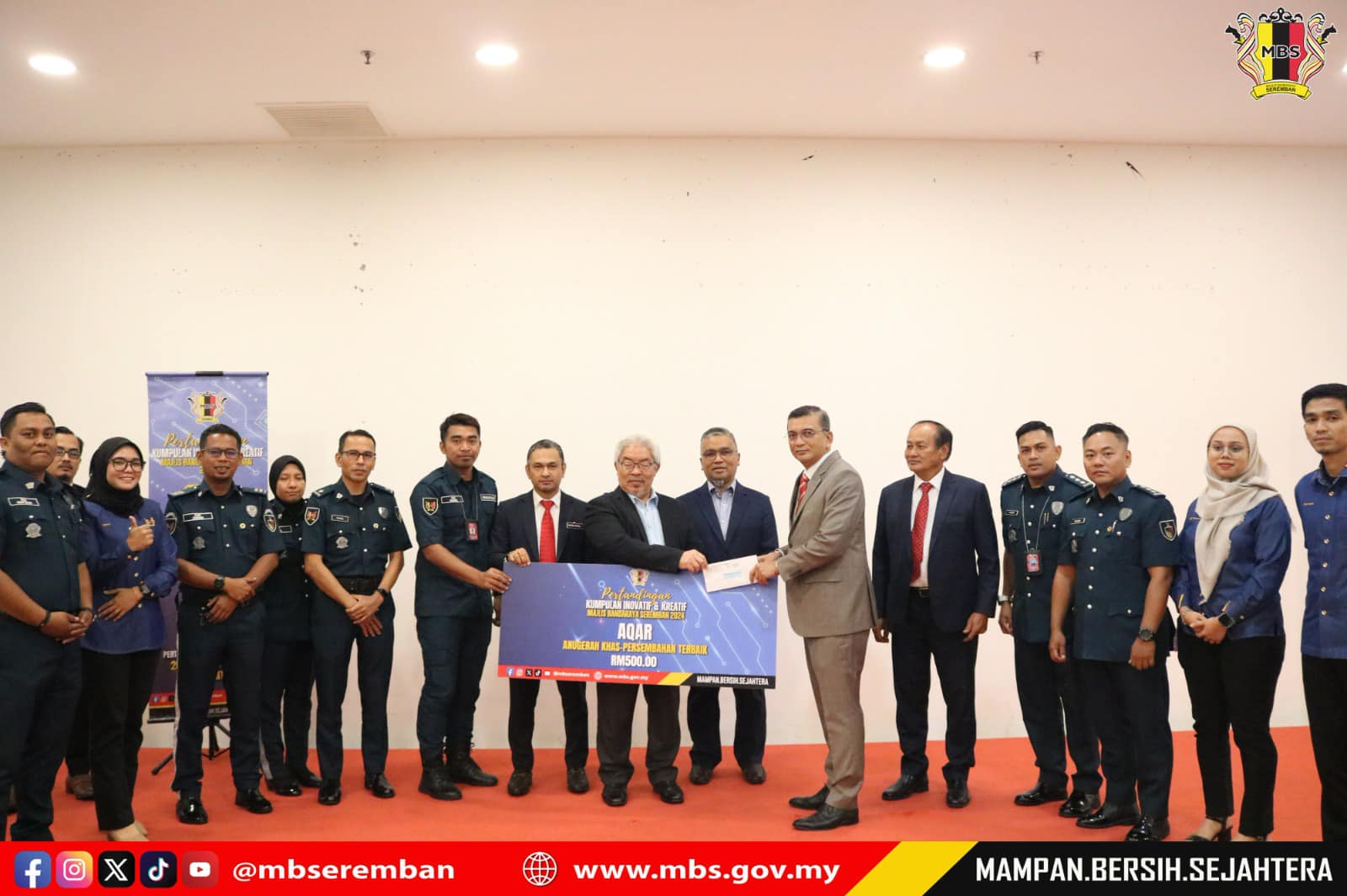 Seremban, 26 Februari 2025 - YB Dato' Haji MK Ibrahim bin Abd Rahman, Yang Dipertua Dewan Undangan Negeri Sembilan telah sama-sama hadir bersama YBhg. Dato' Masri bin Haji Razali, Datuk Bandar MBS bagi menyempurnakan Majlis Penyampaian Hadiah Pertandingan Kumpulan Inovatif & Kreatif 2024 Peringkat MBS di Ruang Dato' Dagang Paroi, Wisma MBS. MBS melalui Unit Komunikasi Korporat telah mengadakan Pertandingan KIK Peringkat MBS pada 20 Disember 2024 yang lalu, sebanyak 5 Kumpulan yang terdiri daripada pelbagai Jabatan & Unit MBS telah menyahut cabaran untuk menyertai pertandingan ini. Ini merupakan salah satu persediaan MBS bagi menghadapi Pertandingan KIK Peringkat Negeri Sembilan malah selaras dengan hasrat YBhg. Datuk Bandar MBS untuk memastikan warga kerja MBS sentiasa aktif dalam kemahiran inovasi dan kreativiti terhadap peningkatan kualiti perkhidmatan di MBS.
