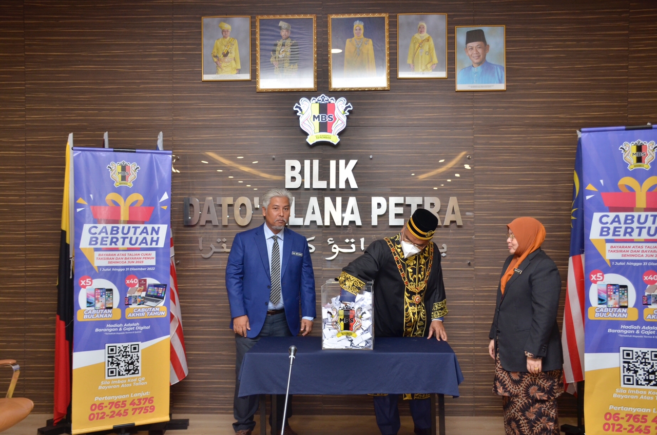 YBhg. Dato’ Masri bin Haji Razali, Datuk Bandar Majlis Bandaraya Seremban telah mempengerusikan Mesyuarat Majlis Penuh (MMP) Bil.12/2022 di Bilik Dato’ Klana Petra, Wisma MBS. Mesyuarat ini turut dihadiri oleh barisan Ahli-Ahli Majlis, Majlis Bandaraya Seremban, Tn, Mas Midyawan bin Yahya, Setiausaha Majlis Bandaraya Seremban, Ketua Jabatan, Ketua Unit dan Pembantu Ahli Majlis, Majlis Bandaraya Seremban secara bersemuka dan atas talian (online). Turut serta YB ADUN-ADUN Kawasan dan rakan-rakan media juga hadir sebagai pemerhati di dalam mesyuarat ini. Selain itu, turut berlangsung sesi cabutan bertuah bayaran atas talian cukai taksiran sehingga 30 jun 2023 bagi bulan November 2022.