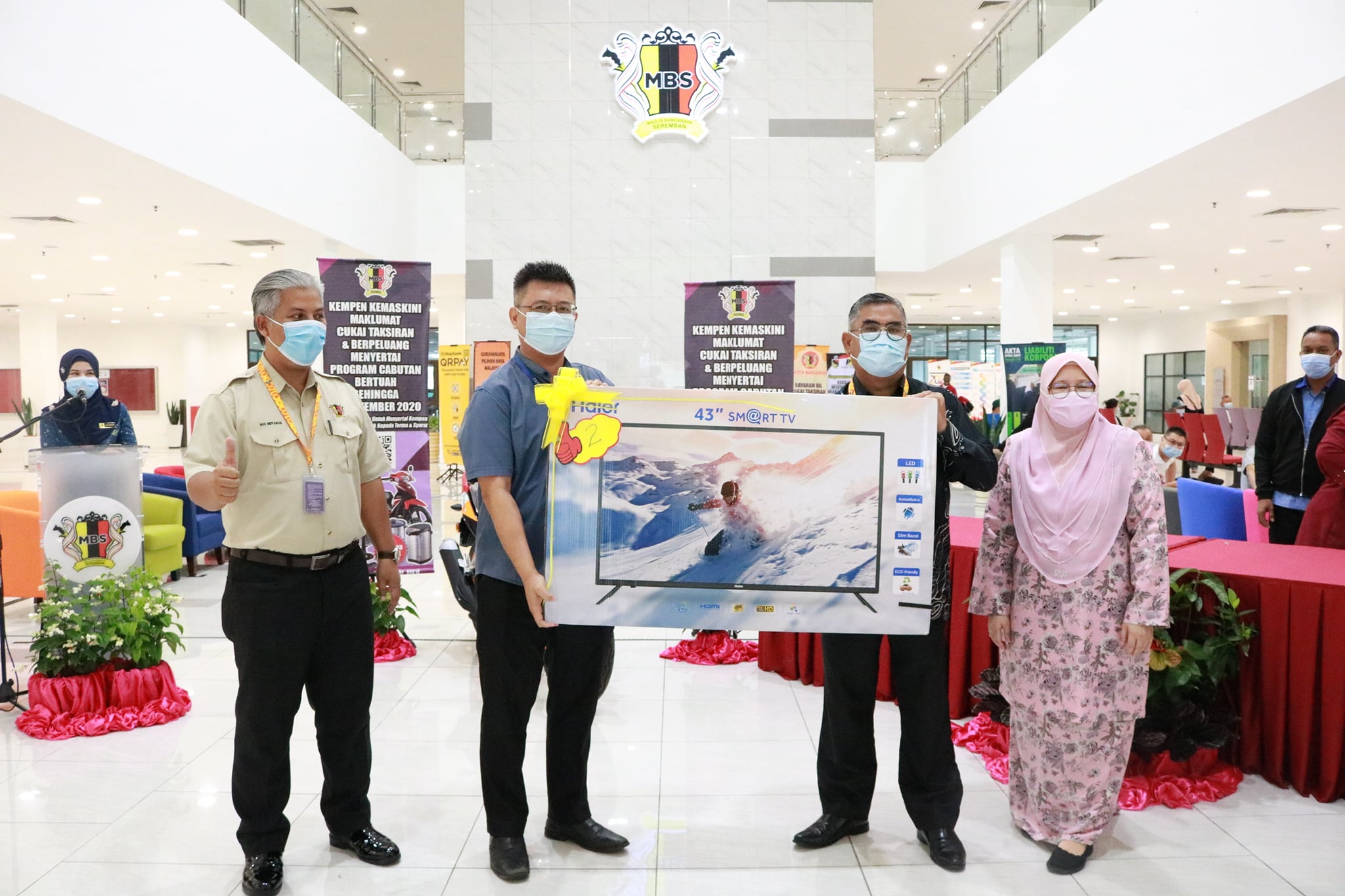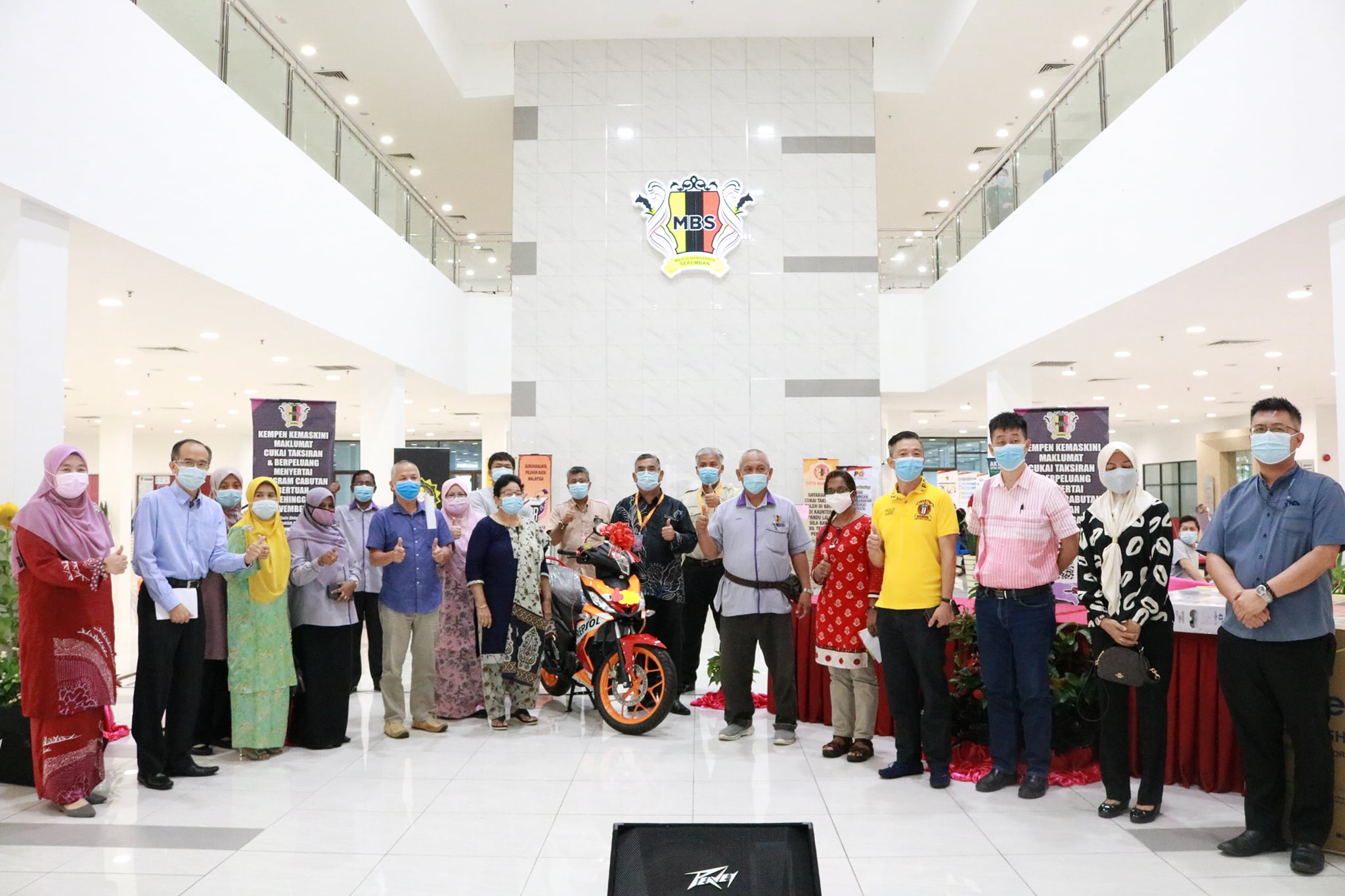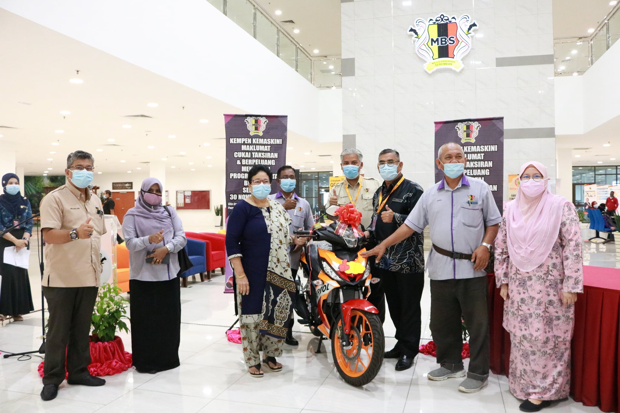 Majlis Bandaraya Seremban hari ini telah mengadakan Penyampaian Hadiah Kepada Pemenang Cabutan Bertuah Kempen Kemaskini Maklumat Cukai Taksiran Majlis Bandaraya Seremban Bagi Tahun 2020 yang telah disampaikan oleh YBhg. Dato’ Haji Zazali bin Salehudin Datuk Bandar Majlis Bandaraya Seremban kepada pemenang di Ruang Legar, Wisma MBS. Seramai 11 pemenang bertuah telah menerima hadiah masing-masing pada hari ini seperti barangan elektrik ketuhar, peti sejuk, mesin basuh, TV LED dan hadiah utama yang berupa sebuah motorsikal berjenama RS150 Repsol Edisi Terhad. Objektif utama program ini adalah untuk menggalakkan dan menghargai orang awam dalam menjelaskan tunggakan dan cukai semasa. Turut hadir pada program ini ialah Ahli Majlis MBS, Tuan Mas Midyawan bin Yahya Setiausaha MBS, Ketua Jabatan, Ketua Unit dan pegawai MBS. Terima kasih diucapkan kepada semua pembayar cukai yang menyertai cabutan bertuah bagi tahun ini dan tahniah kepada semua para pemenang.