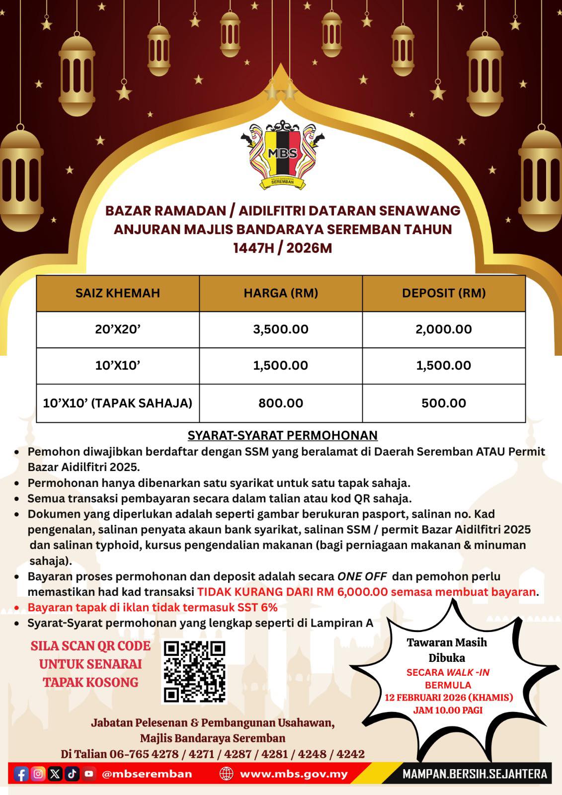 Tawaran masih dibuka secara “walk-in” bermula 12 Februari 2026 (Khamis) jam 10.00 pagi.