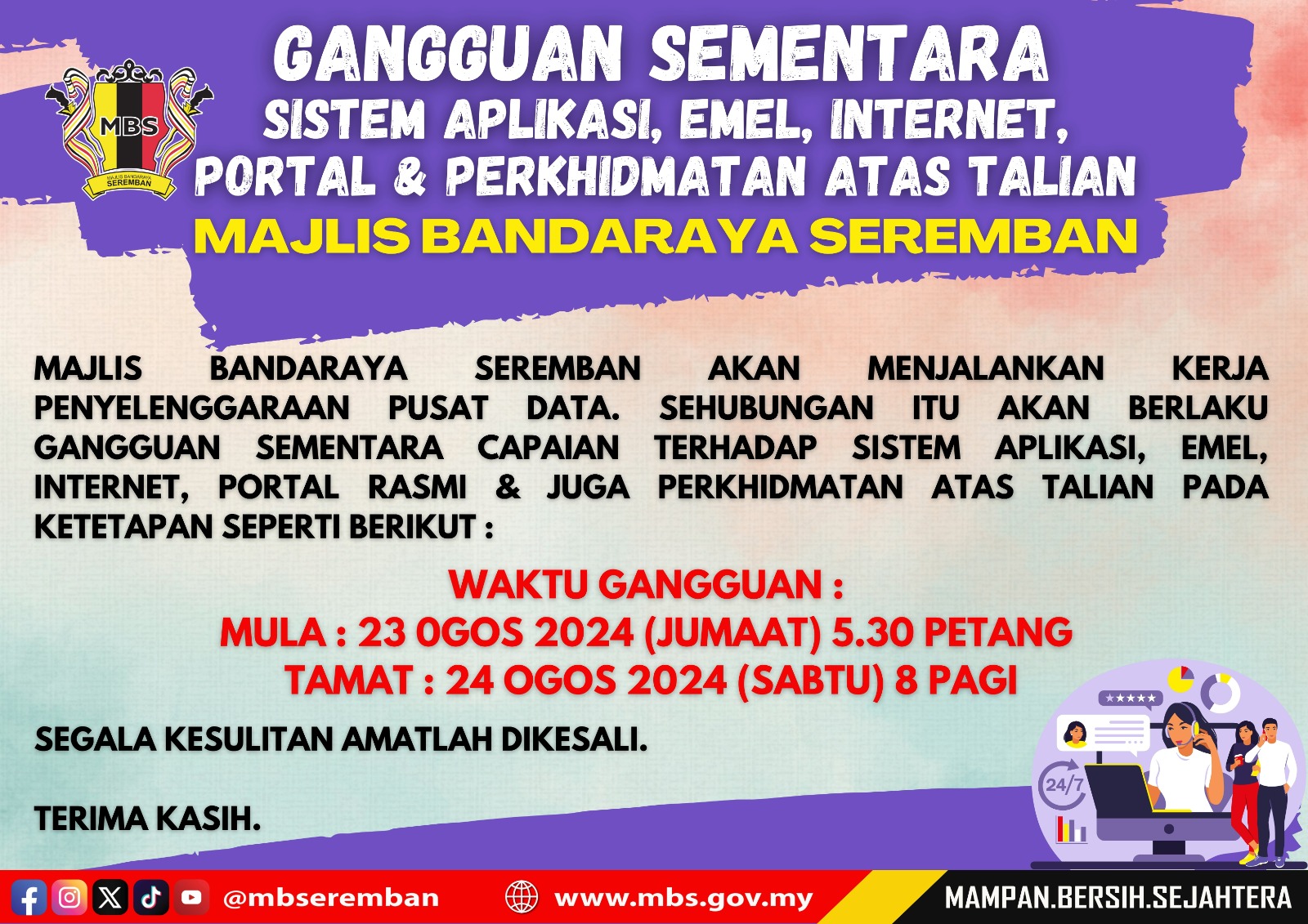 Majlis Bandaraya Seremban akan menjalankan kerja penyelenggaraan pusat data. Sehubungan itu, akan berlaku gangguan sementara capaian terhadap sistem aplikasi, emel, internet, portal rasmi dan juga perkhidmatan atas talian pada ketetapan seperti berikut :-
