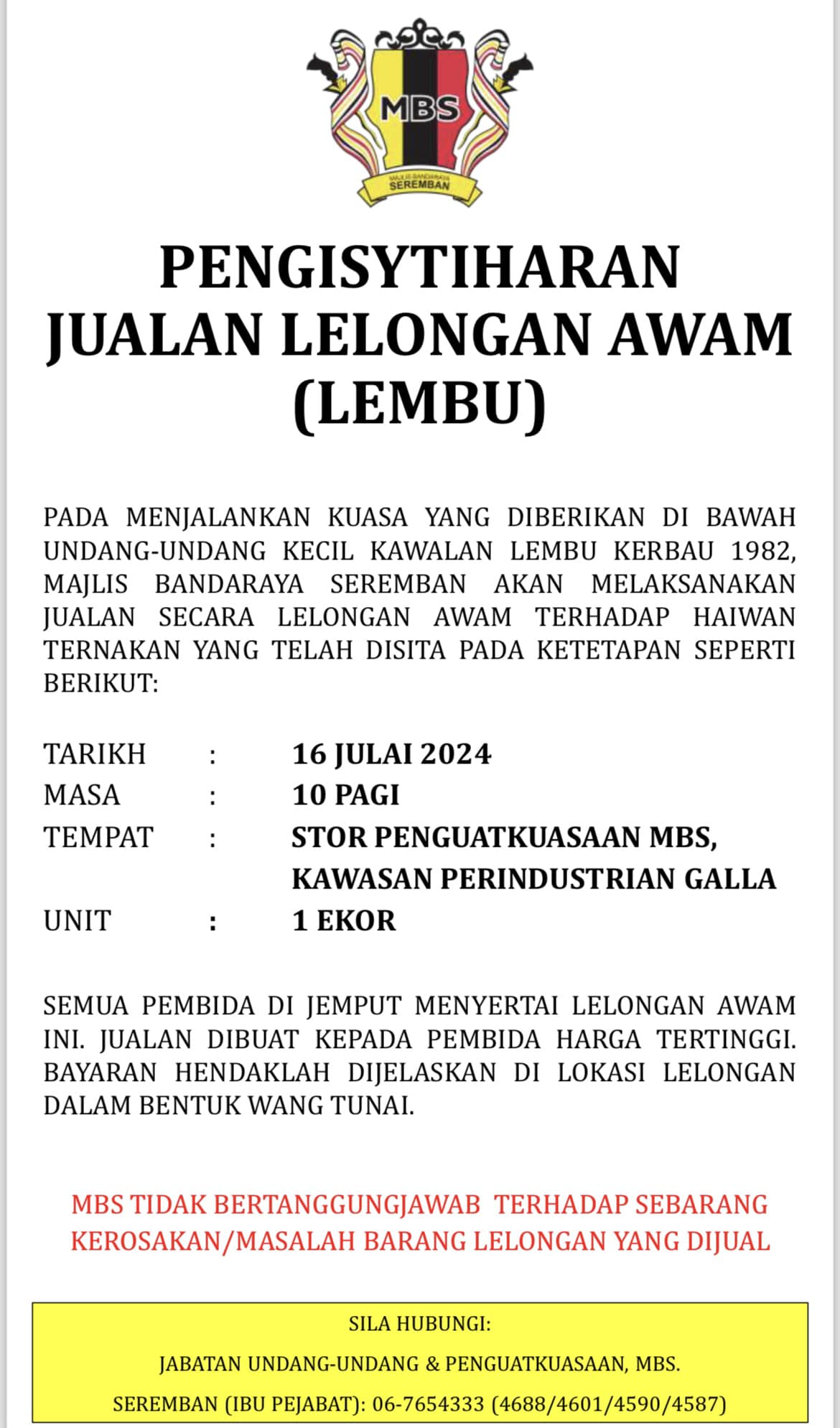 Jika terdapat sebarang pertanyaan boleh hubungi Jabatan Undang-Undang & Penguatkuasaan MBS ditalian 06-7654688 / 4601 / 4590 / 4587