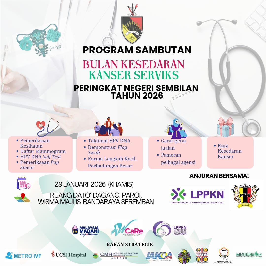 Program anjuran LPPKN Negeri Sembilan dengan kerjasama Majlis Bandaraya Seremban ini bertujuan meningkatkan kesedaran awam tentang kepentingan saringan awal bagi mengurangkan risiko Kanser Serviks yang menjadi faktor kematian ketiga tertinggi dikalangan wanita.